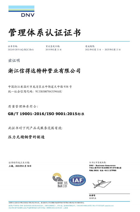 公司已全面通過了ISO9001:2008質(zhì)量管理體系認證、14000環(huán)境管理體系認證、18000職業(yè)健康管理體系認證、國家質(zhì)量檢驗檢疫總局A2-B類壓力管道元件制造許可、 歐盟PED認證及德國AD-2000產(chǎn)品強制認證、美國ASME材料產(chǎn)品認證、信得達擁有1條穿孔生產(chǎn)線,10條冷拔生產(chǎn)線8條冷軋?zhí)胤N無縫鋼管生產(chǎn)線。